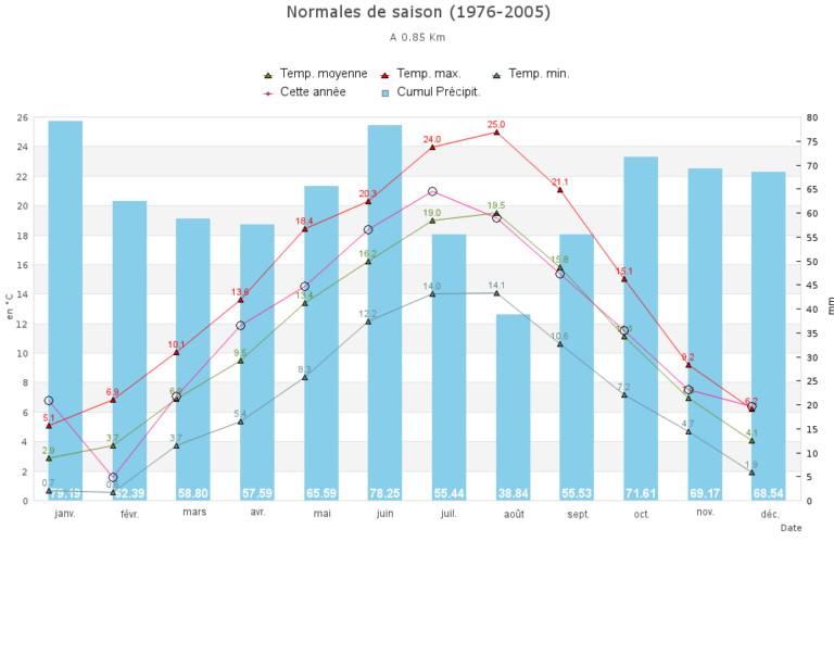 Les températures en janvier étaient très douces (+4°C) puis très froides en moyenne en février (-2.1 °C). La saison s’est terminée par un pic de froid du 26 au 28 février remarquable par son caractère tardif. C’est certainement l’une des causes de la très grande mortalité observée cette année sur les colonies de manière générale.